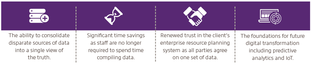 As different departments including finance, procurement and operations, were each producing their own sets of figures, the business needed to create one source of reliable data insights that all parties could agree upon. The data needed to be cleaned up and consolidated into one integrated view so it could be used for accurate reporting and analysis.
